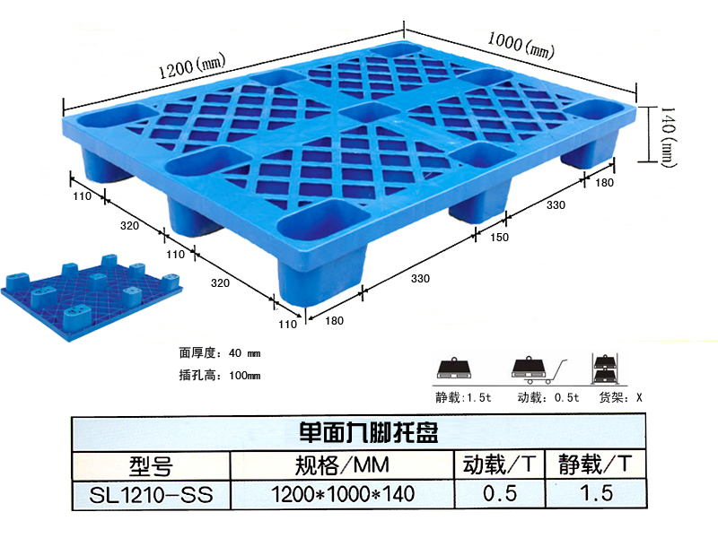 注:九腳網格托盤內部可加入鋼管,是為了達到增加承載的目的,延長托盤的使用壽命,塑料托盤如要在低溫環(huán)境中長期使用,要選擇全新料生產的產品。